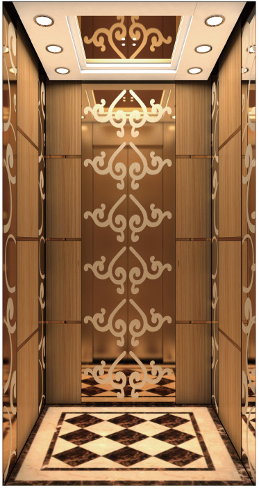 轎壁:后壁鈦金鏡面蝕刻不銹鋼,兩側(cè)木紋裝飾鈦金不銹鋼條,鈦金鏡面蝕刻不銹鋼,輔助板木紋裝飾嵌鈦金不銹鋼條