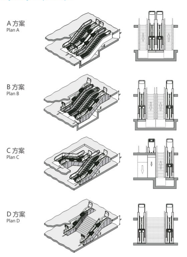 合理布置,科學規劃:購物車電梯四種布置方案如下: