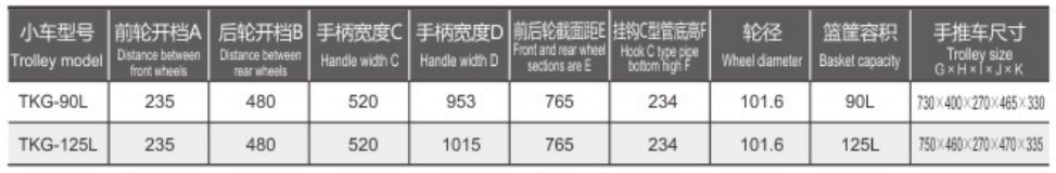 主車體框架采用高強度硬質拉鋼橢圓型管材,主梁材料一次成型,整體焊接工裝自動機械手焊接,籃筐采用實心圓鋼整體焊接,表面底層采用鍍鋅處理,表面電泳或噴涂防腐處理,整車結構設計合理,符合各項安全指標,堅固耐用,90L的承載能力小于100KG,125L的承載能力小于130KG。